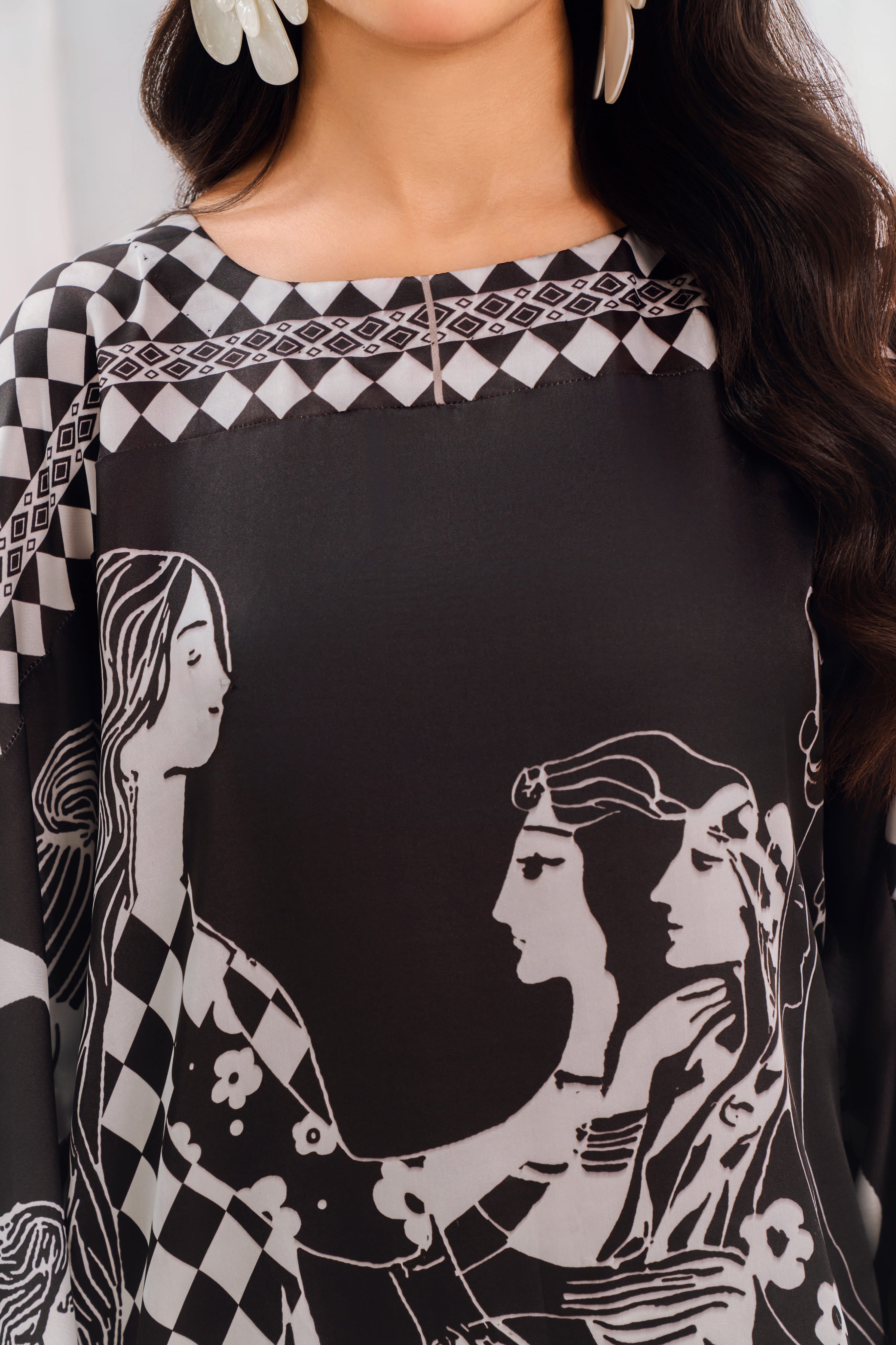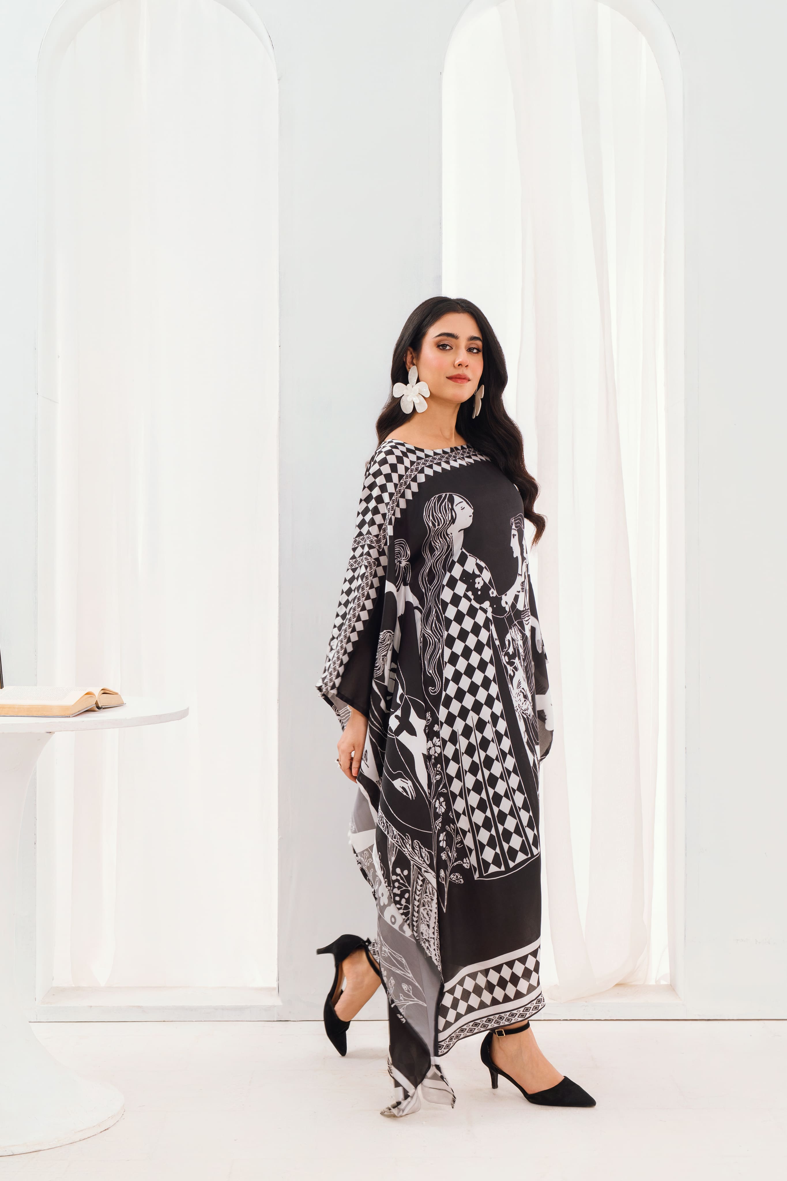 Gracefully designed in luxurious silk fabric, this black and white printed kaftan is a statement piece of timeless elegance. The fluid drape and artistic monochrome print create a modern yet classic look. Perfect for casual wear,evening gatherings or festive occasions, this piece offers comfort with effortless sophistication.