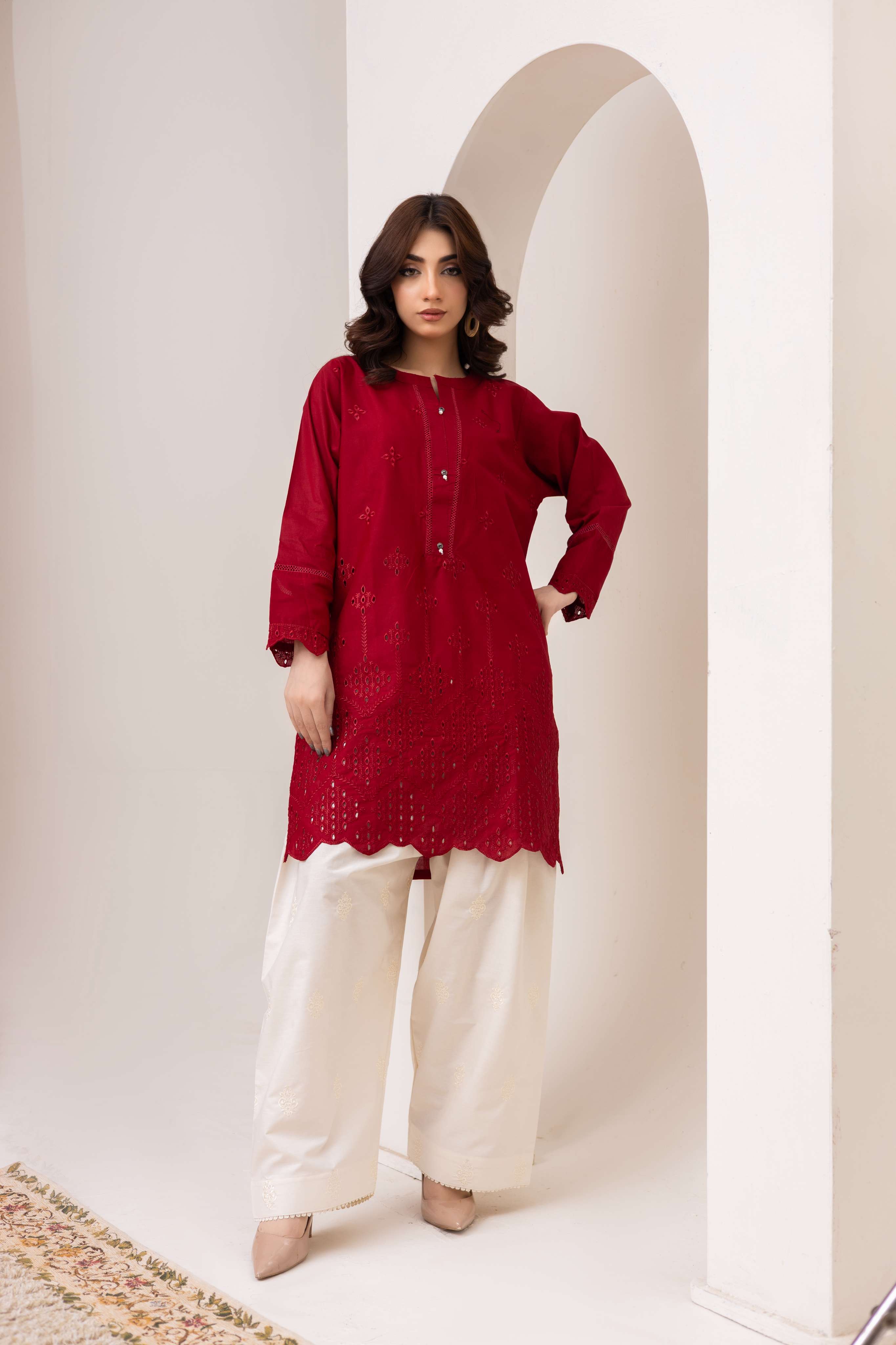 A sophisticated 2-piece maroon outfit featuring intricate embroidery and cutwork on the front and sleeves, finished with a stylish scalloped hemline. Paired with off-white embroidered trousers for a chic and timeless look.