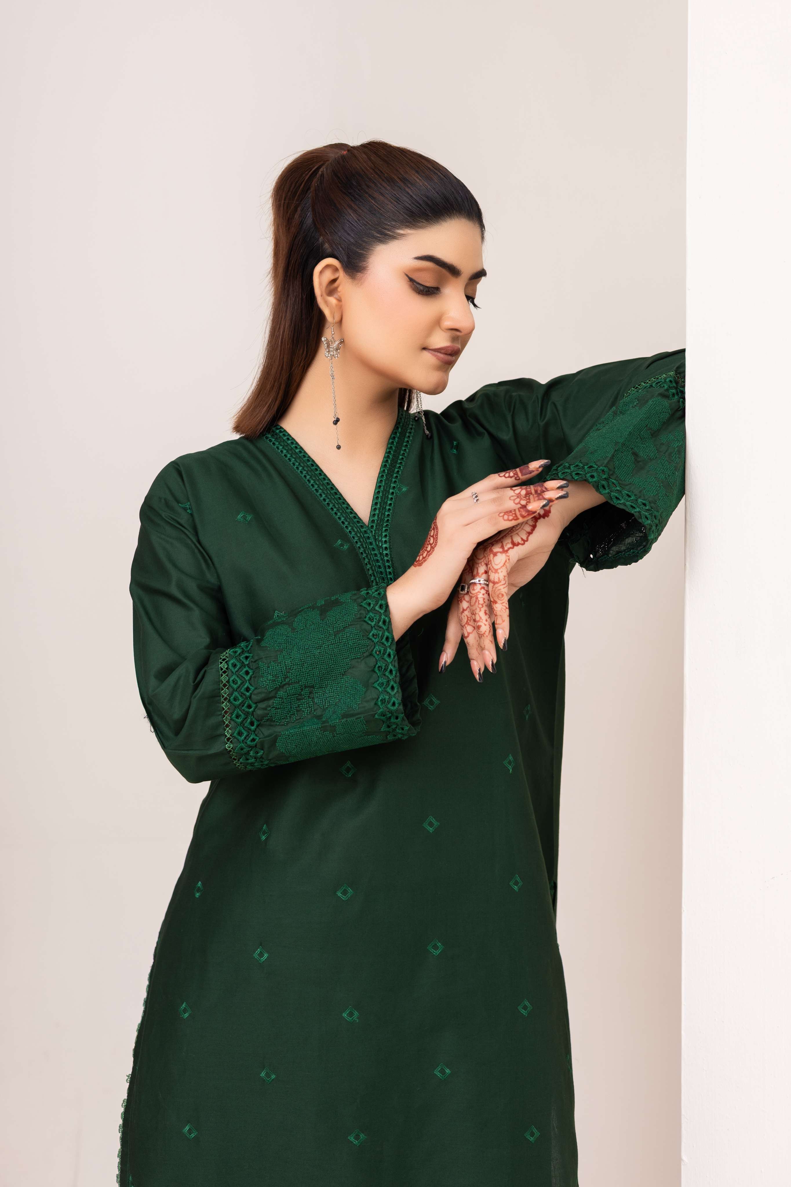 A graceful 2-piece dark green suit featuring a straight kurta with delicate embroidery and lace detailing on the neckline, sleeves, and hem. Paired with matching wide-leg trousers for a modern yet elegant look. Perfect for casual outings, office wear, or semi-formal gatherings.